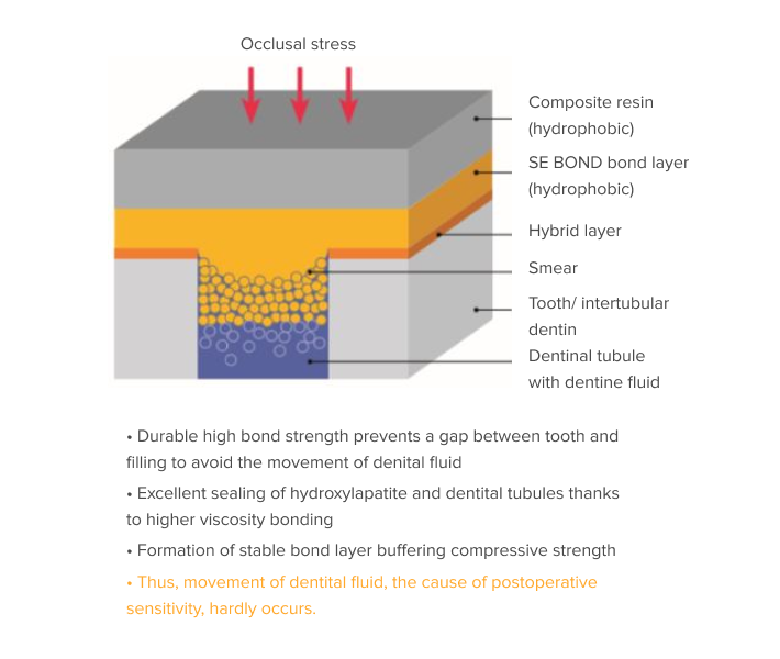 Der sanfte selbstätzende Primer von CLEARFIL™ SE BOND minimiert Irritationen durch sich verschiebende Dentinflüssigkeiten. Durch die Applikation des höherviskosen Bondings nach dem Primerschritt entsteht eine starke und stabile Bondingschicht. Diese Schicht sorgt für eine herausragende Abdichtung der Dentintubuli, wodurch okklusale Belastungen durch sich möglicherweise verschiebende Dentinflüssigkeiten vermieden werden. Das Ergebnis: minimale postoperative Sensibilitäten.