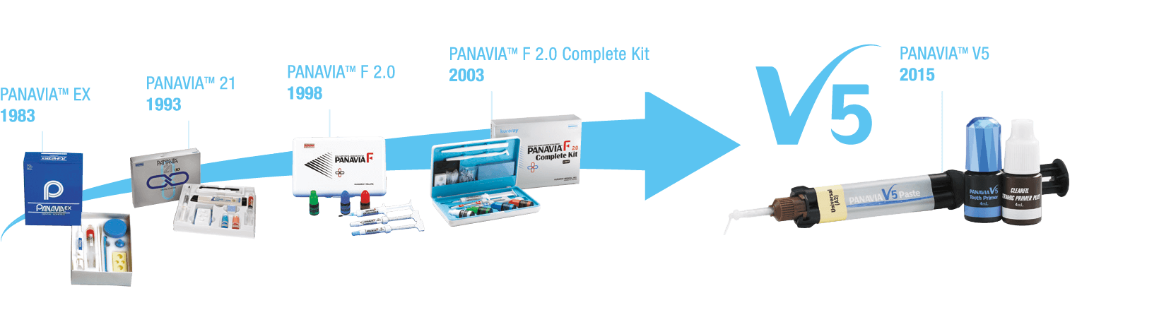 • 2015 Mit PANAVIA™ V5 wird die Erfolgsgeschichte rund um das Original-MDP-Monomer weitergeschrieben. Panavia V5 ist der volladhäsive Befestigungszement für alle Fälle. Einfaches Handling in Praxis (Restaurationen jedweder Art) und Labor (Hybridabutments).