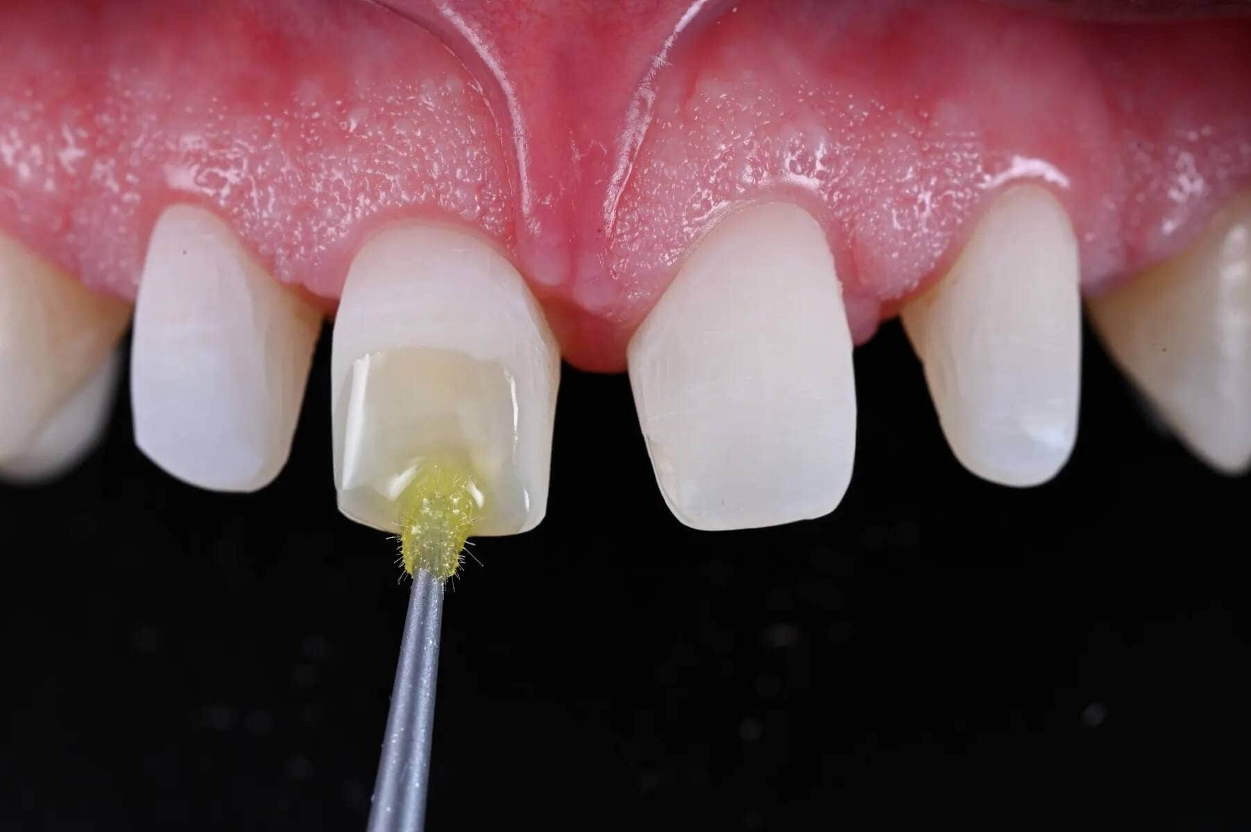 Selektives Auftragen des Befestigungskomposits auf jene Bereiche des geätzten Schmelzes, die nicht gefährdet sind, durch Feuchtigkeit kontaminiert zu werden.
