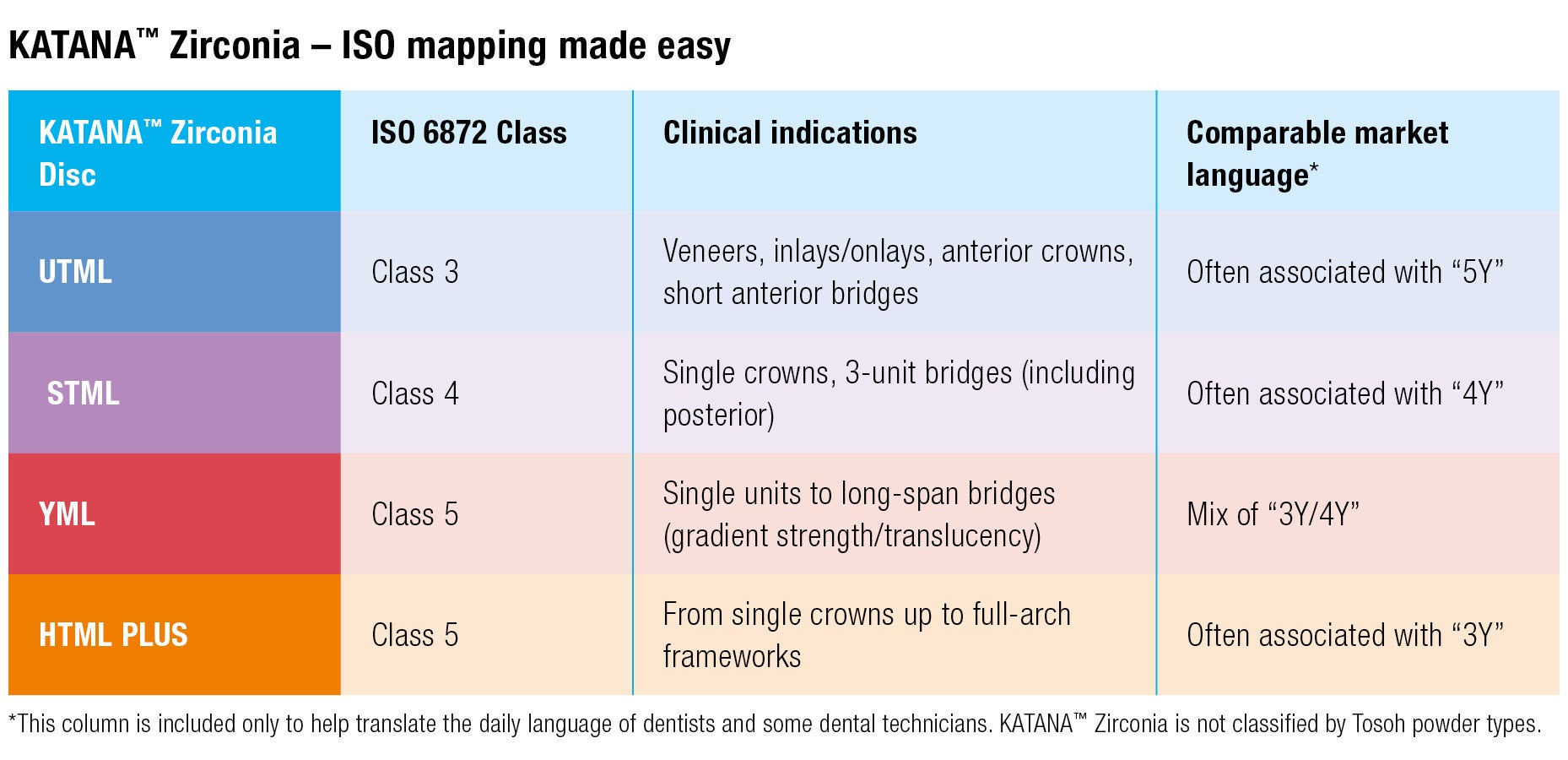 KATANA™ Zirconia discs of Kuraray Noritake Dental Inc. are made of proprietary powders and advanced multi-layered technology developed in-house. The unique performance these blanks deliver cannot be simply described with the aid of the Tosoh system. Instead, we rely on the internationally recognized ISO 6872 classification — a standard that reflects clinical indications and material performance with precision.
