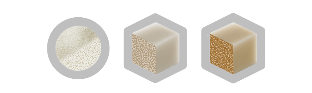 Les charges à particules ultrafines sont soigneusement teintées et traitées en surface dès la première étape. Pour KATANA AVENCIA Block 2 ML, ces charges, aux nuances différentes, sont ensuite organisées en couches afin de créer une structure multicouche harmonieuse, offrant des transitions naturelles de teinte et de translucidité.