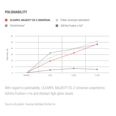 Svojstva koja osiguravaju estetske rezultate tijekom vremena su lakoća poliranja ovog materijala i zadržavanje sjaja. CLEARFIL MAJESTY ES-2 Universal nadmašuje druge proizvode koji nude pojednostavljeni odabir nijanse. Vrlo se dobro može polirati za prirodan izgled nalik caklini, a vrijednost sjaja ostaje visoka čak i nakon abrazije četkicom za zube omogućujući odlične dugoročne rezultate. Mehanička svojstva, istaknuta za nijanse stražnjih zuba, prisutna su i kod nijansi za prednje zube.