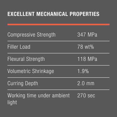 Dobrom uravnoteženosti svojstva trošenja osigurana je postojanost okluzije tijekom vremena bez utjecaja na antagonist. Malo polimerizacijsko naprezanje pri skupljanju materijala pomaže spriječiti rubnu promjenu boje i mikropropuštanje koje može dovesti do sekundarnog karijesa.