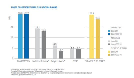 La dentina è uno dei substrati più difficili a cui aderire. Consapevoli dell'alta qualità dei nostri prodotti abbiamo deciso di eseguire un test comparativo tra diversi cementi. In questo modo, abbiamo potuto verificare le eccellenti proprietà adesive di PANAVIA V5, comparabili a quelle del Gold Standard dell’adesione self-etch CLEARFIL SE BOND.