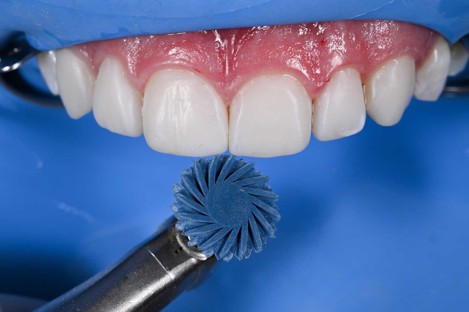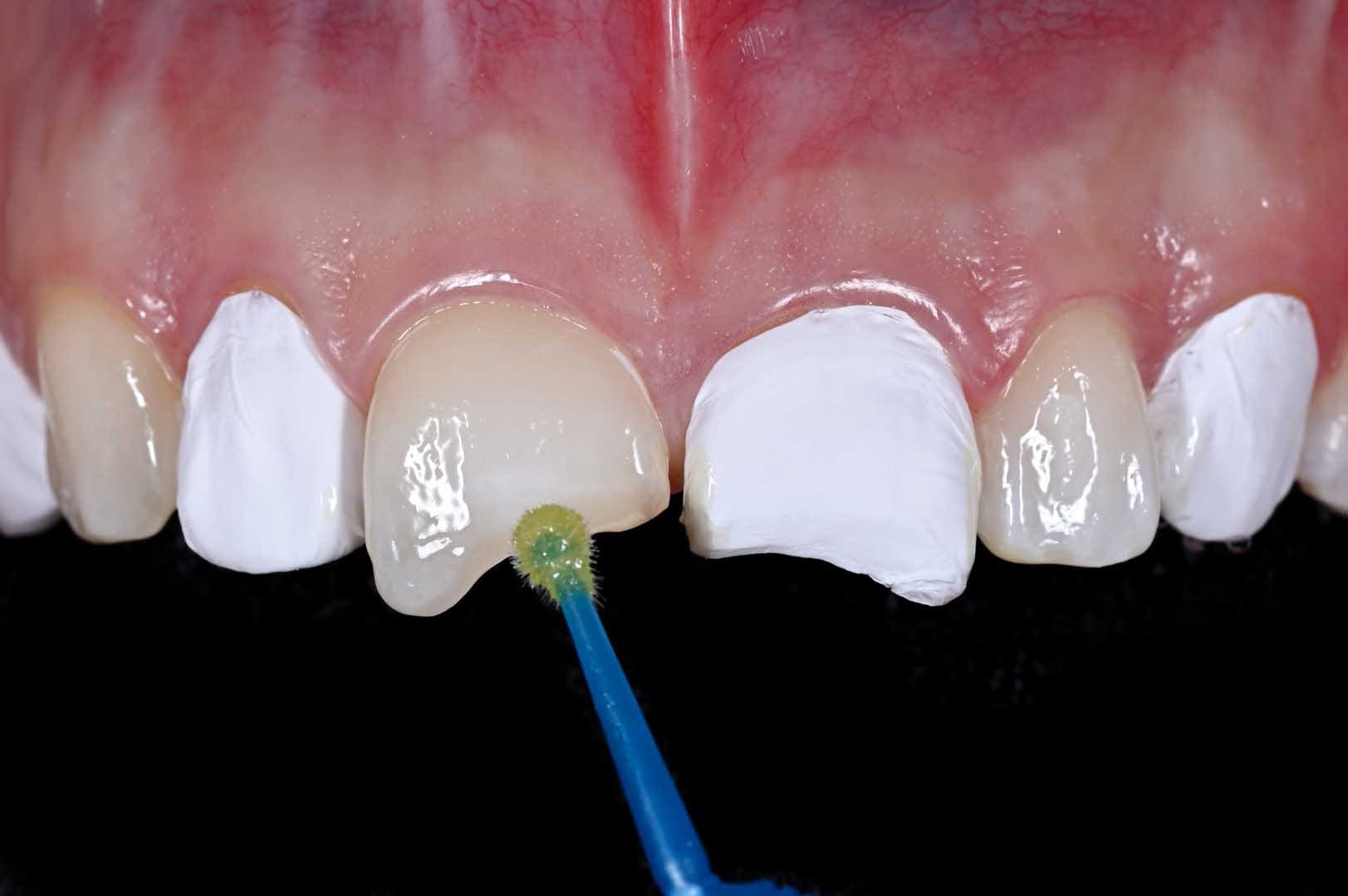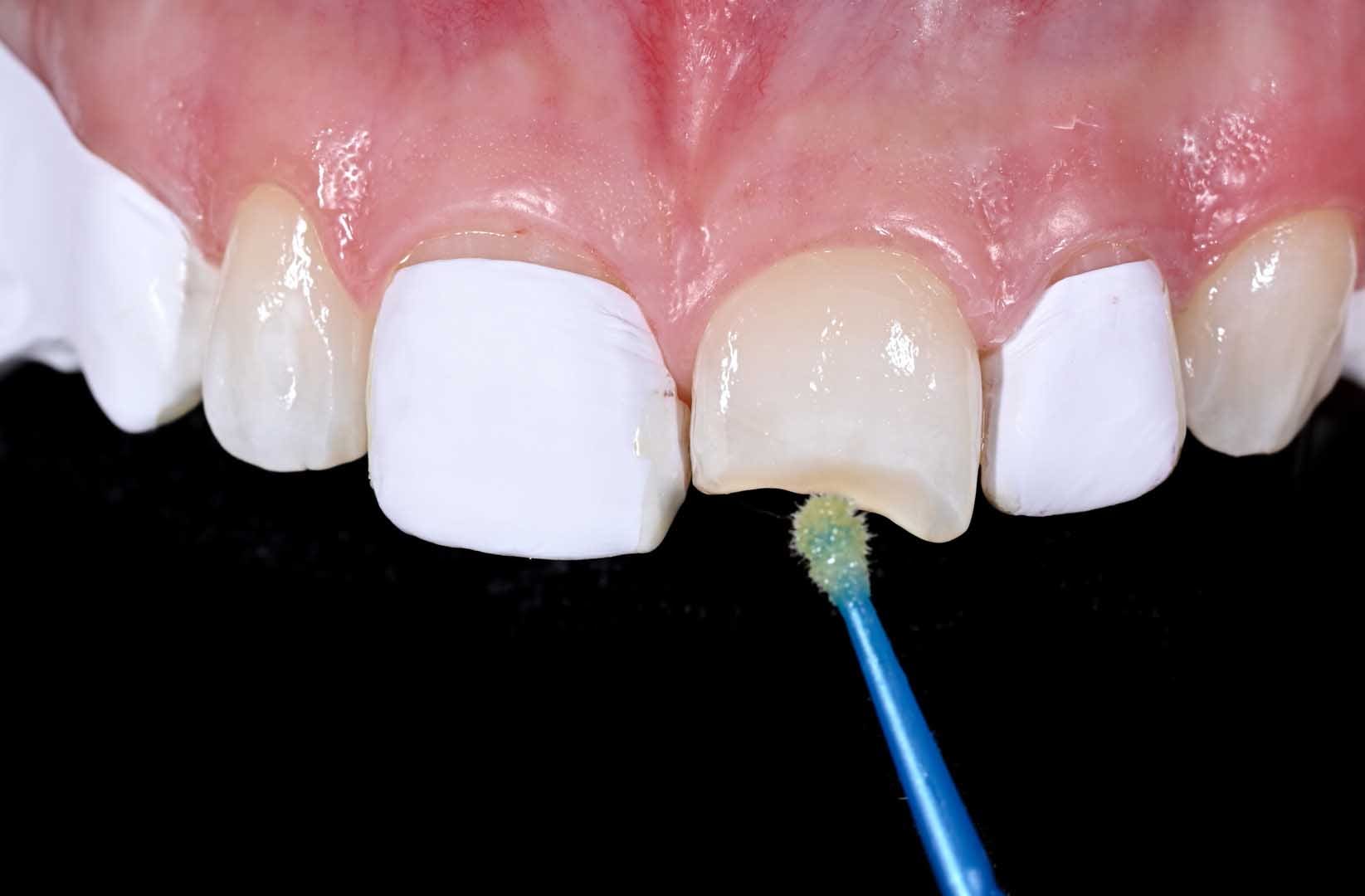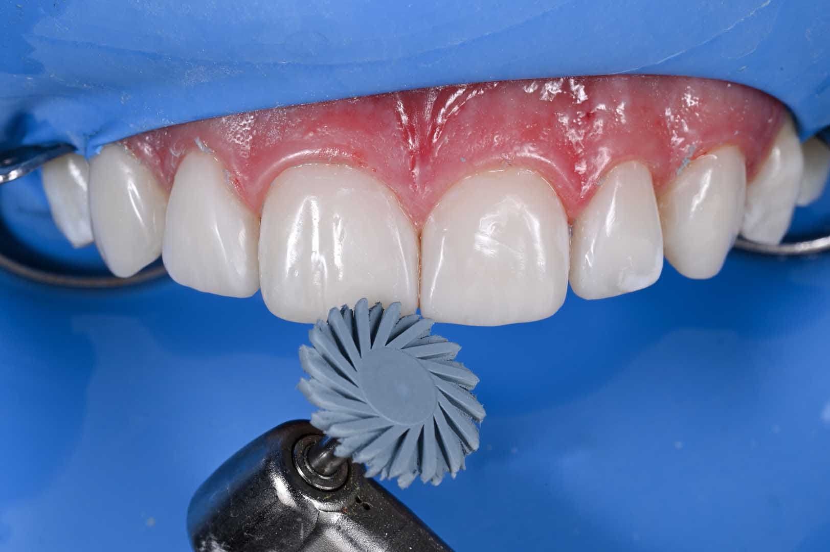 Dopo ottenimento del consenso informato, i vecchi restauri su 11 e 21 sono stati rimossi con frese diamantate sotto irrigazione. I margini sono stati rifiniti e bisellati (Fig. 5). La mascherina è stata posizionata sull’arcata superiore e valutata per stabilità e ritenzione. Irestauri sono stati eseguiti in maniera alternata e per isolare gli elementi adiacenti, è stato applicato uno strato di Teflon (0,076 mm). Le superfici dei denti da restaurare sono state sabbiate con ossido di allumina (50µm), mordenzate con acido ortofosforico al 37% per 15 s, risciacquate e asciugate (Fig. 6).