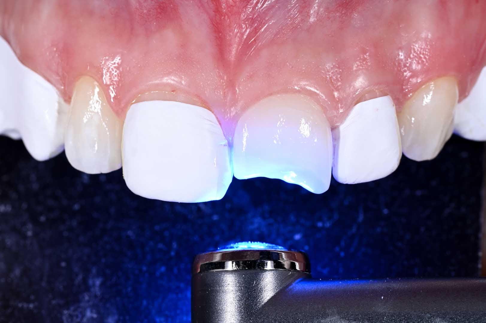 È stato quindi applicato un adesivo universale (CLEARFIL™ Universal Bond Quick 2, Kuraray Noritake) (Fig. 7) e polimerizzato con lampada LED (SmartLite® Pro, Dentsply Sirona), 10 s per dente) (Fig. 8).