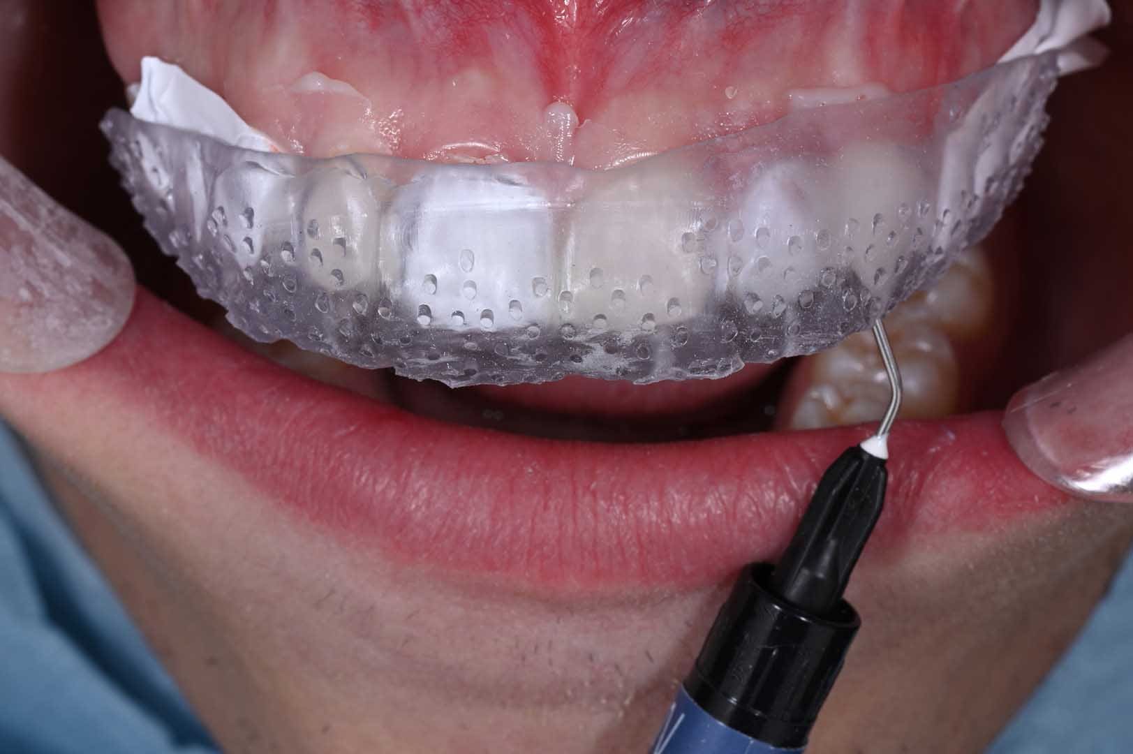 Attraverso i fori, è stata iniettata una resina fluida (CLEARFIL MAJESTY™ ES Flow Low, colore W, Kuraray Noritake) fino a riempire la mascherina dei primi denti preparati (Fig. 9). Dopo polimerizzazione per 40s per ciascun dente, la mascherina è stata rimossa e una seconda polimerizzazione è stata eseguita una volta rimossa la mascherina. Gli eccessi di resina sono poi stati eliminati con uno scaler.