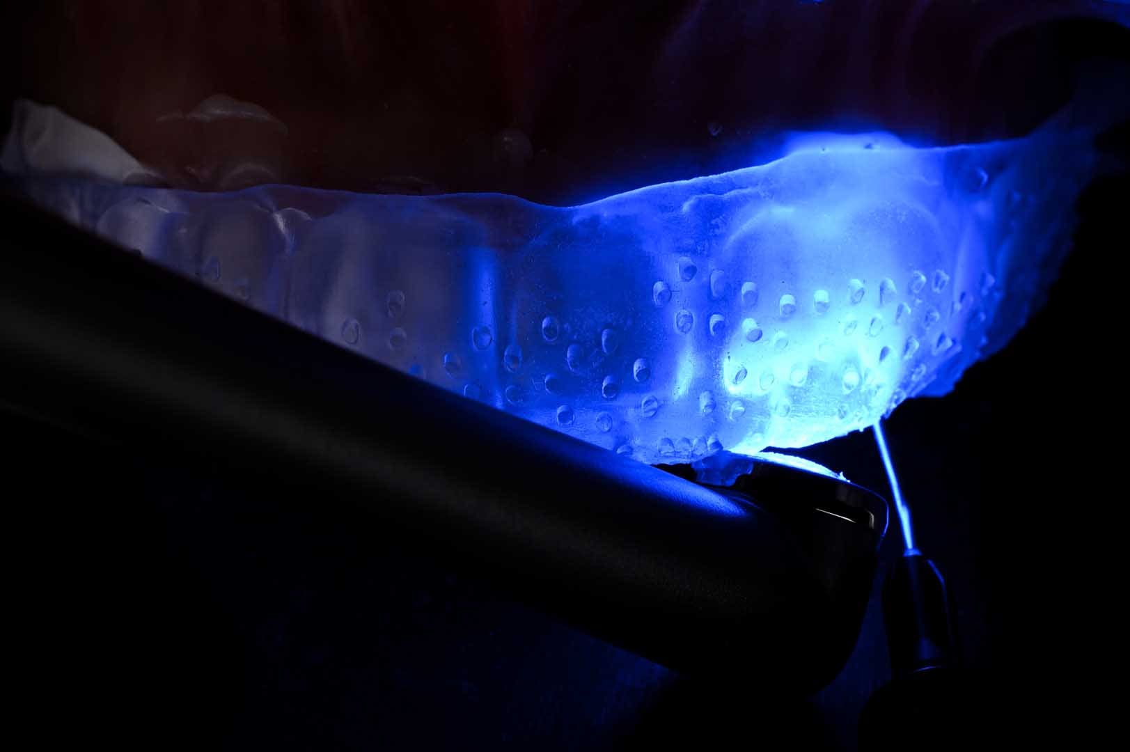 Tramite la scansione intraorale (Trios 5, 3shape) è stata realizzata una ceratura digitale sulle basi della quale è stato progettato digitalmente una mascherina digitale per l’iniezione del materiale (Fig. 2). La mascherina è stata quindi stampata in resina trasparente (IBT Flex Resin, Formlabs) (Fig. 3). Una volta terminato la post-polimerizzazione, sono stati realizzati dei fori calibrati per il puntale della siringa utilizzata per l’iniezione della resina composita fluida (Fig. 4).