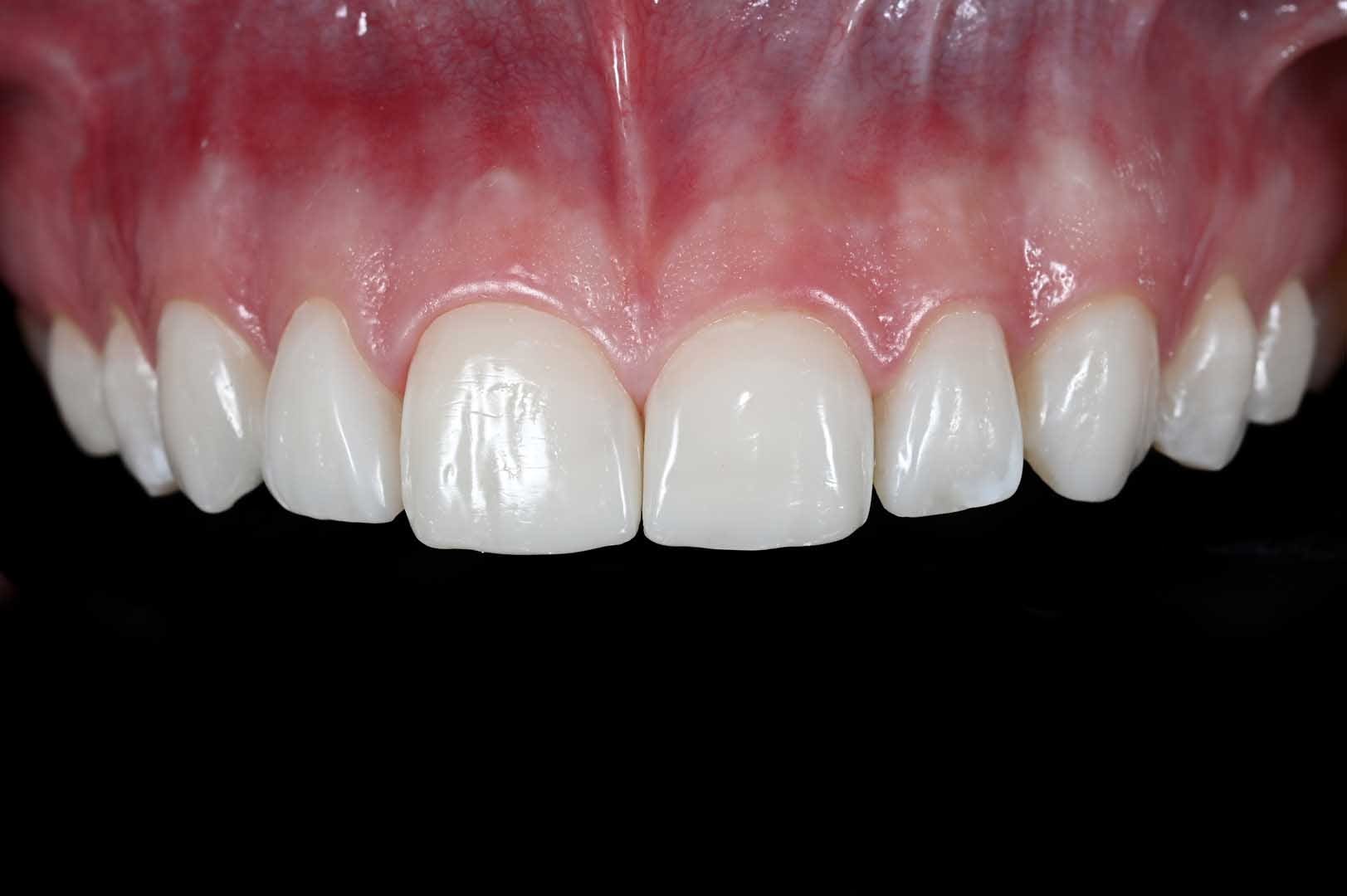Una volta rimossa la mascherina sono stati eliminati gli eccessi, è stata inserita una diga di gomma tagliata in centro al fine di migliorare il comfort del paziente e la visibilità e i restauri sono stati rifiniti con frese diamantate a grana fine. Infine è stata effettuata una lucidatura progressiva con dischi in silicone (TWIST™ DIA for Composite, Kuraray Noritake) (Figg. 16-17 ).