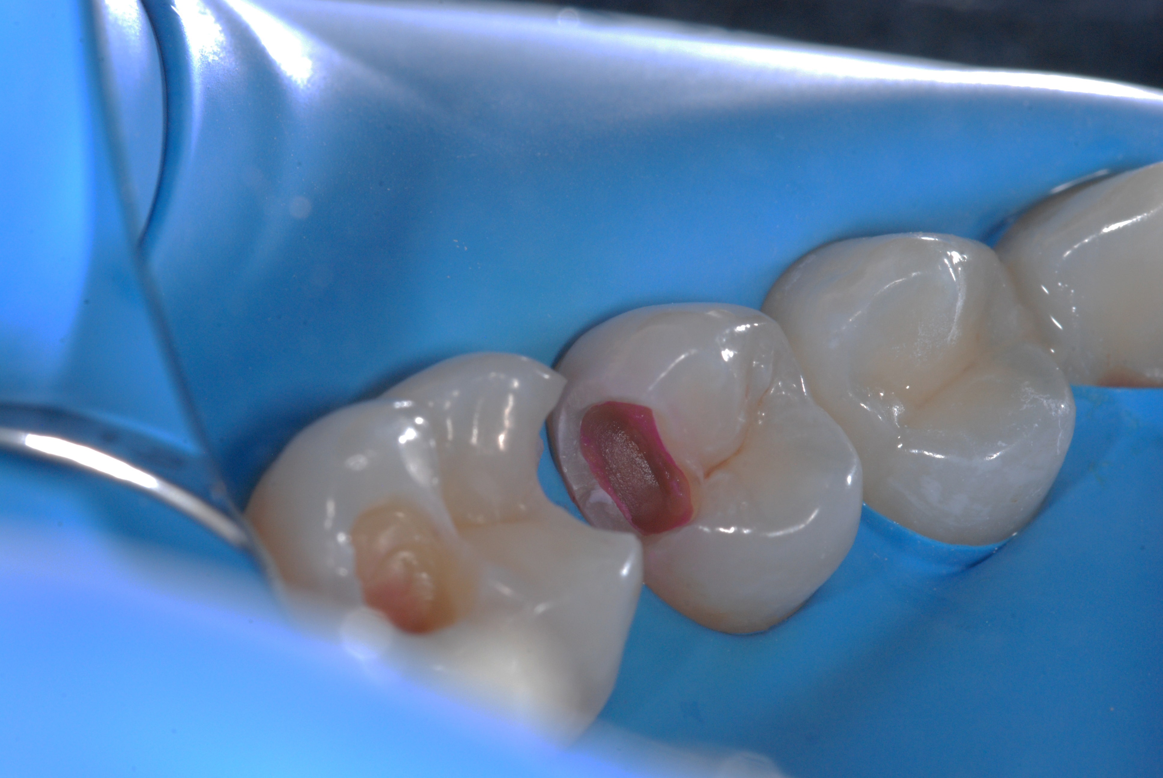 Per guidare la rimozione selettiva della dentina cariata, si utilizza Caries Detector, che distingue visivamente tra dentina infetta e affetta (Fig. 2, 3). L’escavazione avviene a secco, a bassi giri, con fresa Cera-Bur fino a completa rimozione del colorante, ottenendo una cavità detersa e non geometrica (Fig. 4).