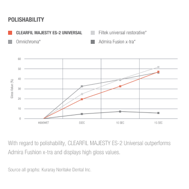 „CLEARFIL MAJESTY ES-2 Universal“ turi labai gerą poliravimo gebą, siekiant, kad išvaizda būtų natūrali ir panaši į tikrą emalį, o blizgumo vertė išlieka aukšta net ir po dantų šepetėlio abrazijos puikiems ilgalaikiams rezultatams. Išskirtos priekinių dantų srities atspalvių poliravimo ir blizgesio savybės yra identiškos ir galinių dantų srities atspalviui.