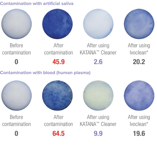 Pēc tam, kad veikta restaurācijas intraorāla pielaikošana, siekalas un/vai asinis samazina saites stiprību. KATANA™ Cleaner augstā tīrīšanas efektivitāte atjauno sākotnējo saites stiprību. Tagad viss ir patiešām sagatavots restaurācijas cementēšanai!
