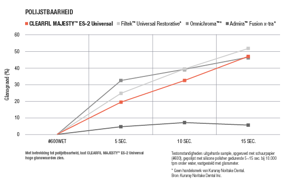 Polijstbaarheid en behoud van glans zijn de werkelijk doorslaggevende eigenschappen voor langdurige esthetische resultaten van een materiaal. En ten aanzien van beide eigenschappen is CLEARFIL MAJESTY ES-2 Universal beter dan, of gelijk aan andere producten met een vereenvoudigde kleurselectie. CLEARFIL MAJESTY ES-2 Universal is uitstekend polijstbaar voor een natuurlijke uitstraling en - om duurzame resultaten te waarborgen - blijft de glansgraad hoog, zelfs na slijtage door poetsen.