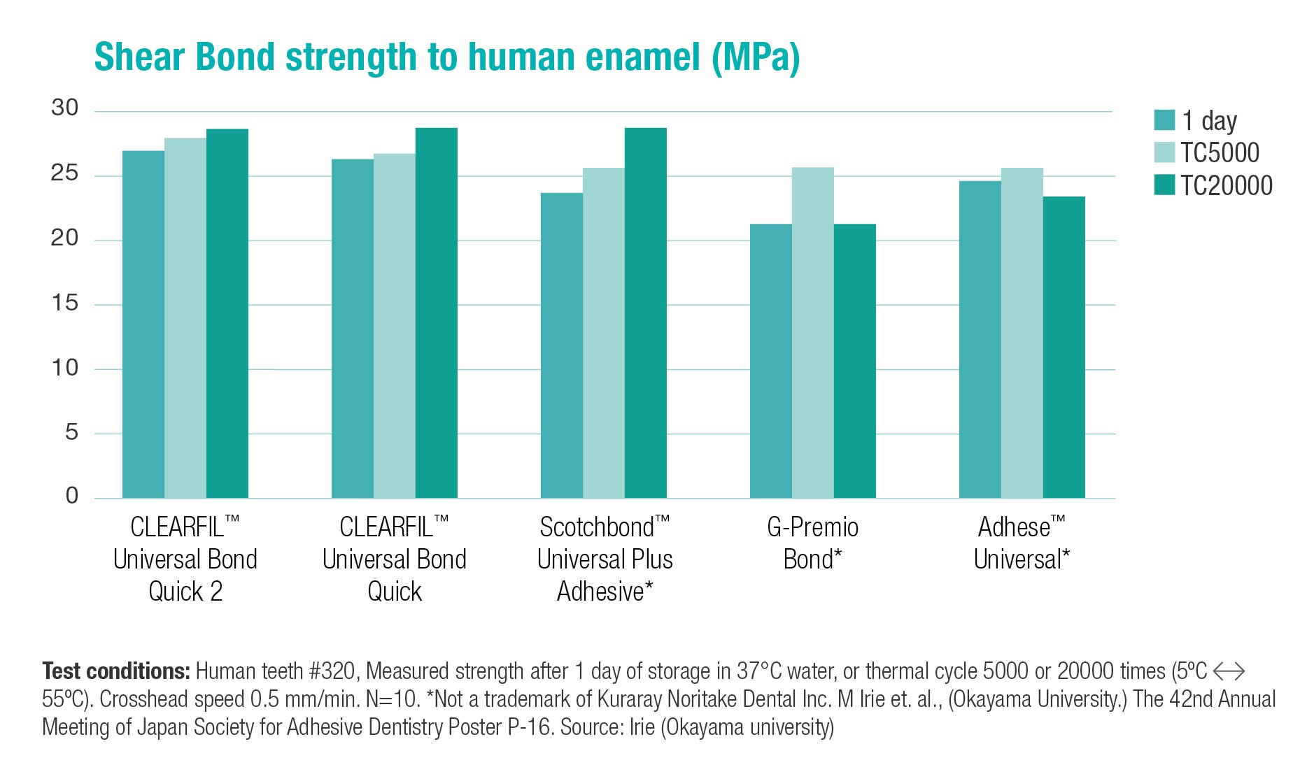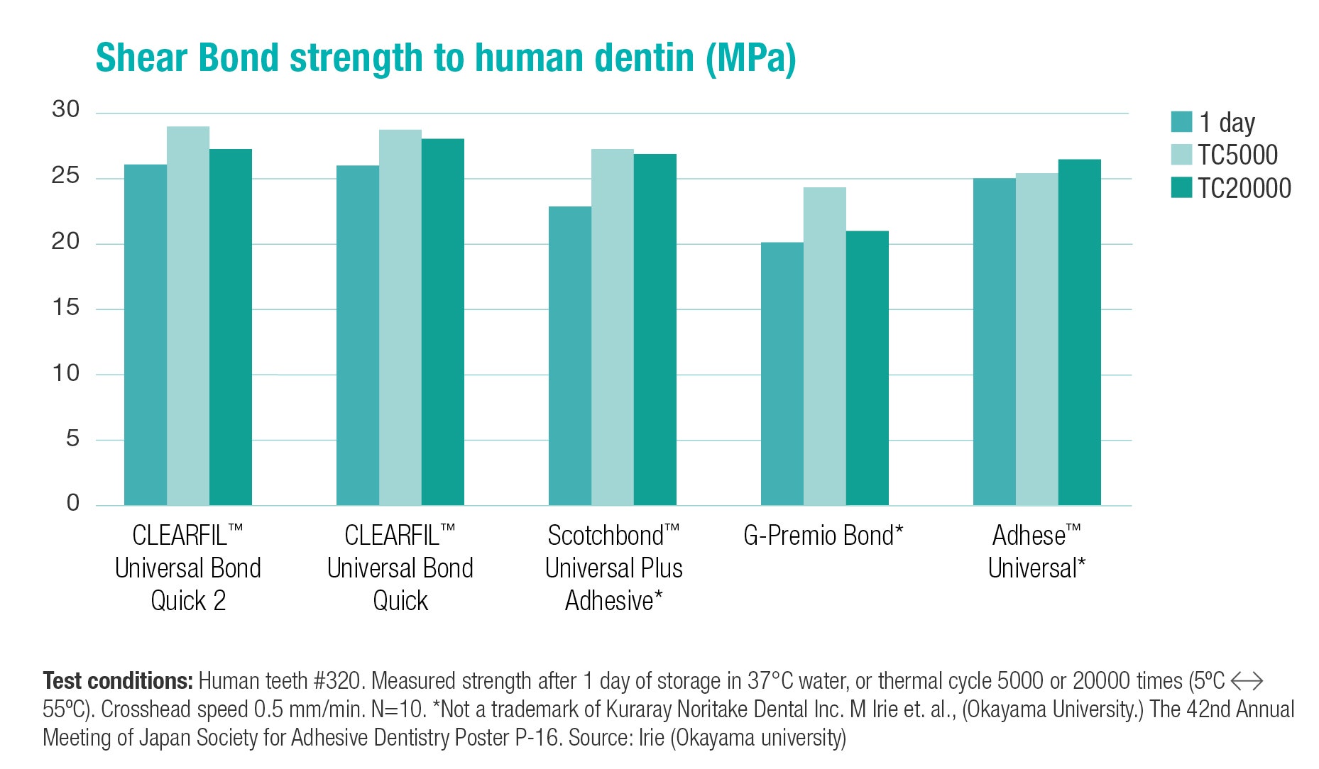 News Feature A new universal adhesive born in Japan Interview with the team at Kuraray Noritake Dental Inc., who developed and brought to life this new universal adhesive. Streamlining, enhancing and refining adhesive procedures – these are the aims of an 5-person team at Kuraray Noritake Dental Inc. in Japan. Recently, the team has developed a next-generation universal adhesive CLEARFIL™ Universal Bond Quick 2 that offers quick and easy application combined with an optimised bonding performance. To learn more about the goals and achievements of the development project, and the benefits of the product, we had a conversation with them. From left to right: Ryo Matsuura and Ryota Murayama (R&D Department), Kazutoshi Ikeda (Production Department), Marina Okada and Yamato Nojiri (Planning & Development Department). Why did you decide to improve CLEARFIL™ Universal Bond Quick? Universal adhesives like CLEARFIL™ Universal Bond Quick are very well received by dental practitioners all over the world mainly due to their versatility and procedural simplicity. In the clinical setting, however, we have identified room for improvement. For example, it can be difficult to establish thin, uniform and strong bonding layers with the currently available products. Water and solvents in universal adhesives often limit the formation of a strong bond layer. A thin bonding layer and the relatively thick oxygen inhibition layer make this type of bonding agent susceptible to degradation by water sorption from dentinal moisture. Highly viscous bonding agents also complicate the ease of application in small cavities and can easily lead to pooling of the adhesive in critical parts of the cavity. Adhesives with a relatively high viscosity may pool or accumulate along margins, and may form a layer that is too thick and may change the morphology of the abutment tooth, a critical factor potentially affecting the fit of an indirect restoration. Generally, bonding agents with a low film thickness and/or are low-filled or unfilled, in turn have a potentially negative effect on the strength of the bonding layer. At Kuraray Noritake Dental Inc., we wanted to address the aforementioned issues and have developed a universal adhesive that is easy to apply and facilitates the establishing of thin, uniform bonding layers exhibiting high strength. What are the indications of CLEARFIL™ Universal Bond Quick 2? The new universal adhesive is indicated for bonding procedures in the context of creating direct restorations with light-cured composite, sealing of a prepared cavity or abutment tooth as a pretreatment for indirect restorations, treatment of exposed root surfaces and hypersensitive teeth, and also the intraoral repair of fractured restorations. Furthermore, the product is a suitable adhesive in post-cementation and core build-up procedures as well as in adhesive cementing of indirect restorations. When used in the context of the cementing of indirect restorations, the bonding to tooth structure of PANAVIA™ SA Cement Universal and of other manufacturers’ self-adhesive resin cements improves, leading to higher bond strengths. What are the corresponding general benefits of CLEARFIL™ Universal Bond Quick AND CLEARFIL™ Universal Bond Quick 2? The general benefits of both products are that they may be used with any etching procedure, plus the fact that there is no need to wait for the adhesive to penetrate the tooth structure after application. In addition, both products contain the original MDP monomer and the amide monomer, responsible for the formation of a thin and strong surface coating. Both products exhibit low technique sensitivity and are suitable for a wide range of indications. Finally, the adhesive monomers and fluoride offer extra protection to the underlying dentin. Monomer image from the brochure You mentioned the original MDP monomer as one of the essential components of the new adhesive and its predecessor. Is there a difference between this original MDP monomer and other MDP monomers available on the market? Our MDP monomer is the only MDP monomer that is manufactured using the originally developed synthesis and purification process. Research has shown that the way MDP is manufactured has indeed an impact on the performance of the monomer itself1. While impurities and dimers detected in MDP monomers synthesized elsewhere negatively affected the immediate and aged micro-tensile bond strength in the in-vitro study, our MDP monomer shows high purity and more favourable test results. Most universal adhesives need to be rubbed into the tooth structure extensively for 10 to 20 seconds. What did you do to eliminate the waiting time independent of the etching procedure, which led to an ultra-quick application procedure? It is the amide monomer which is mainly responsible for an improved penetration speed into the tooth structure. The hydrophilicity of this monomer is much higher than the hydrophilicity of the HEMA monomer that is typically used. This provides for a better penetration into the moist dentin. The amide monomer’s polymerisation characteristics are better, and, following polymerisation, leads to higher stability in a wet environment due to the formation of a highly cross-linked polymer network. In combination with MDP, an efficient long-term performance will likely be achieved. For optimal outcomes, the adhesive is simply rubbed into the tooth structure as described in the IFU: “Apply BOND with a rubbing motion to the entire cavity wall with the applicator brush. No waiting time is required.” What are the additional benefits that CLEARFIL™ Universal Bond Quick 2 has to offer? First of all, we improved the viscosity and film thickness by optimizing the manufacturing method. The thin adhesive layer prevents pooling in the cavity, around abutments and along margins, creating a uniform bonding layer. Simply put, the new adhesive is applied thinly and spreads evenly. At the same time, the 