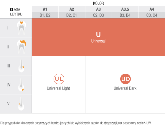 Dla wszystkich wypełnień w odcinku bocznym, niezależnie od podstawowej barwy tkanek zalecany jest odcień U. Do wypełnień w odcinku przednim, które wymagają większej estetyki i przezierności zalecany jest odcień UL (odpowiednik A1 oraz A2) oraz odcień UD (odpowiednik A3, A3.5, A4) w zależności od podstawowej barwy tkanki zęba. Dla przypadków klinicznych dotyczących bardzo jasnych lub wybielonych zębów, do dyspozycji jest dodatkowy odcień UW (odpowiednik W/XW). Opakowanie zawiera instrukcję doboru rodzaju odcienia dla wszystkich klas ubytków.