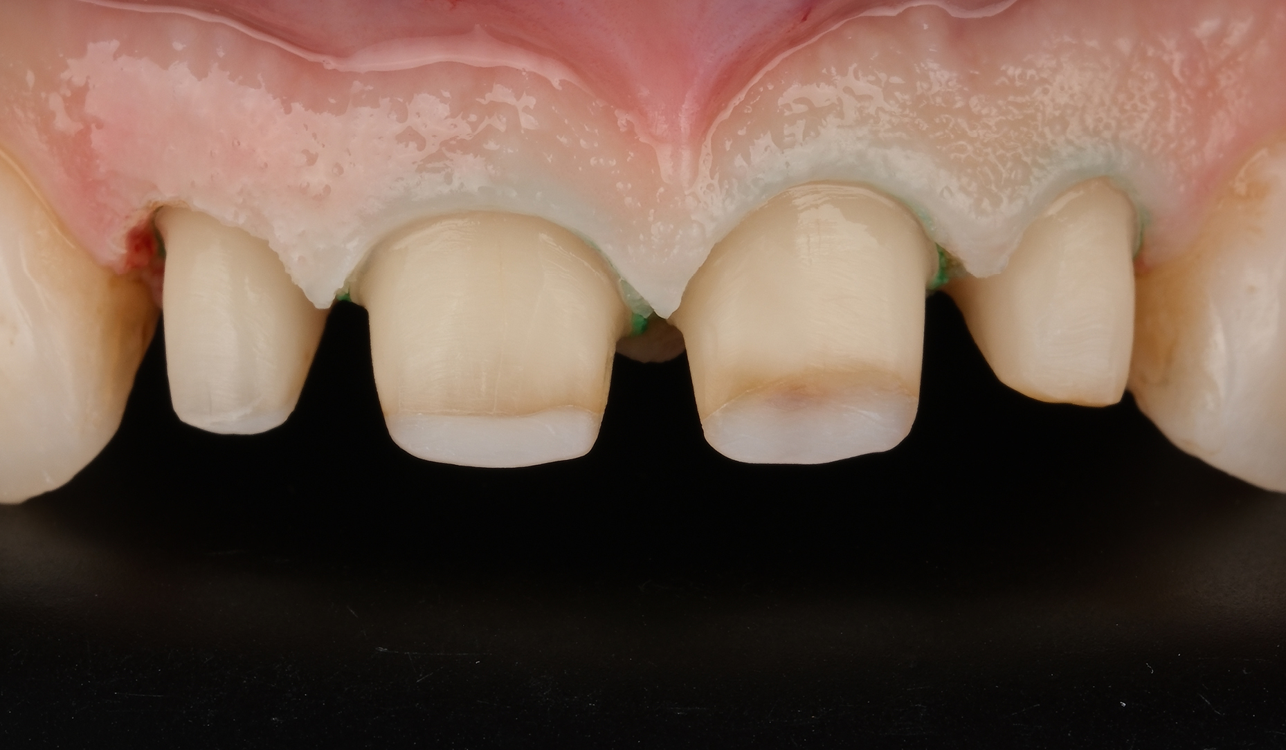 Rys. 1: Zęby filarowe wykazujące przebarwienia  - zaleca się wybór ton jaśniejszego materiału na podbudowę.
