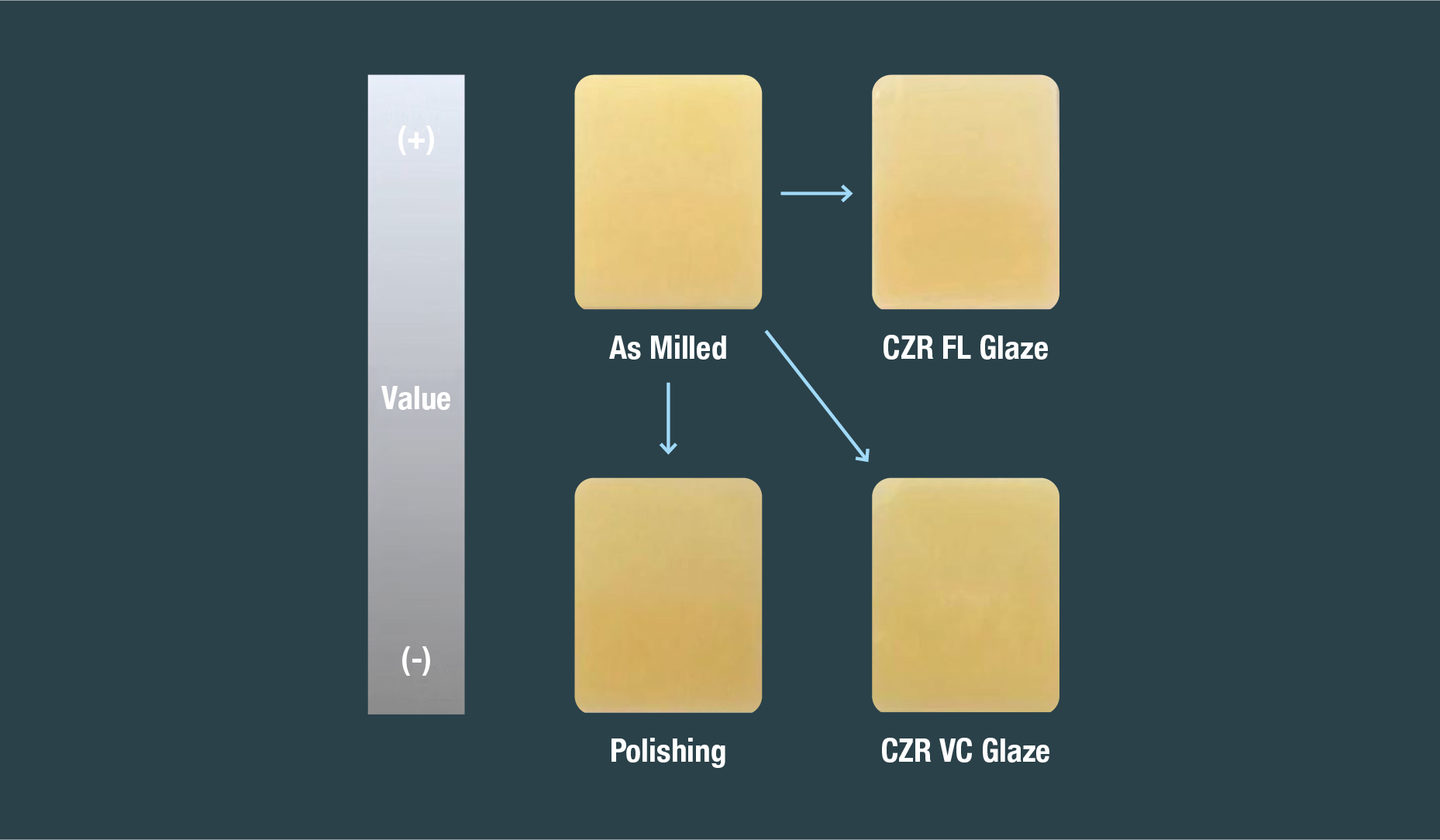 Bardziej czasochłonne metody wykończeń, takie jak napalanie porcelany lub charakteryzacja przy użyciu płynnej ceramiki CERABIEN™ ZR FC Paste Stain, zazwyczaj wykonuje się w laboratorium protetycznym, gdzie najczęściej stosuje się frezarkę pracującą na sucho. W takich warunkach odcień cyrkonu zwykle odpowiada wybranemu kolorowi docelowemu.