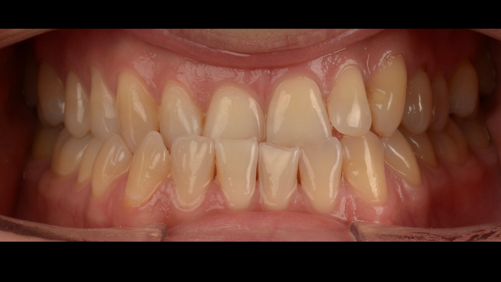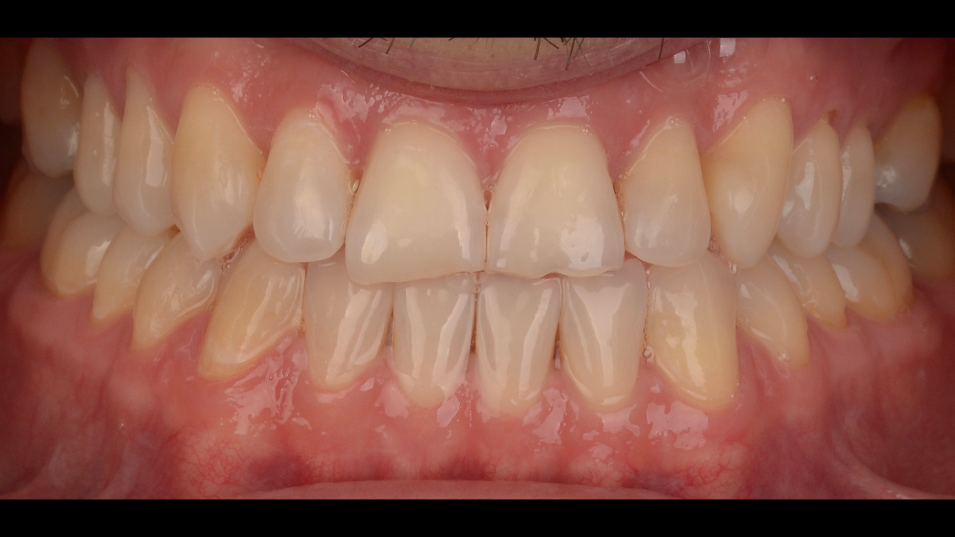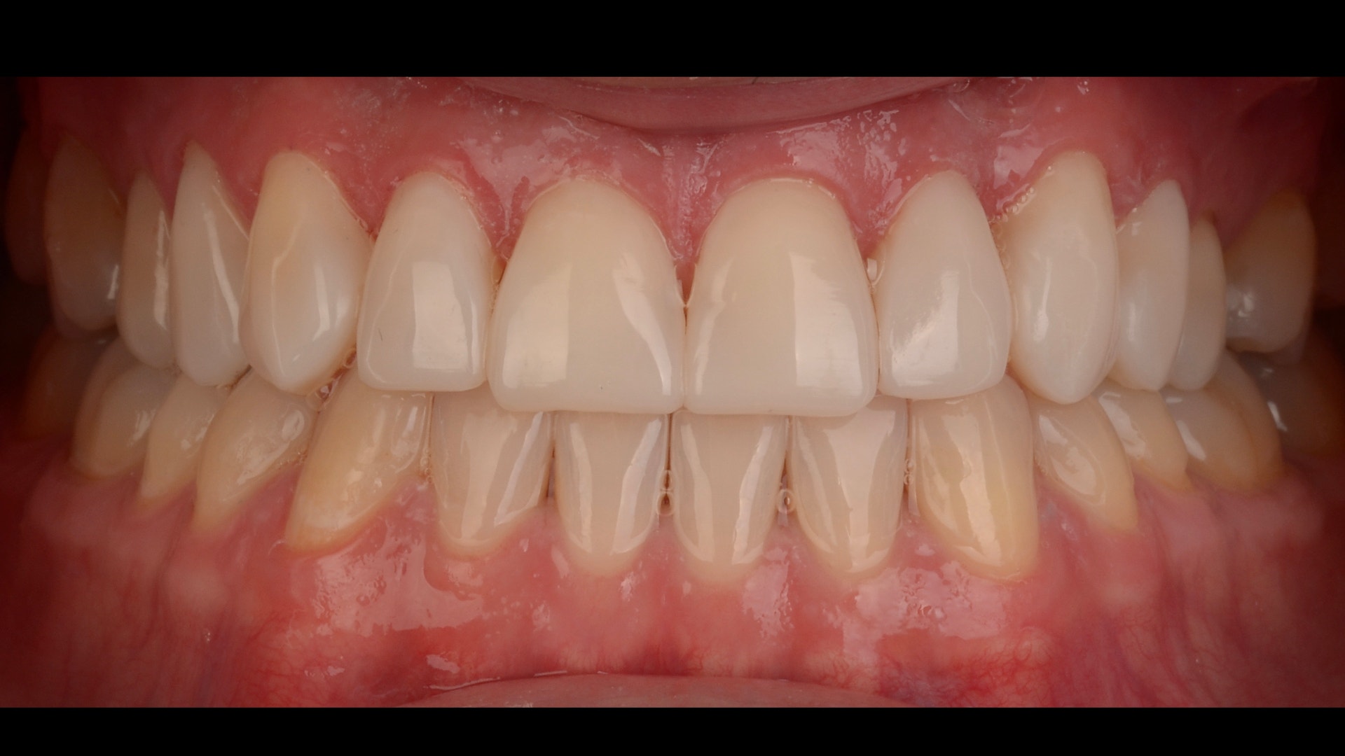 Stan po korekcie kształtu i wielkości zębów techniką Injection Flow przy zastosowaniu płynnego kompozytu CLEARFIL MAJESTY™ ES Flow w pośredniej gęstości Low i odcieniu XW. Do nadania odbudowie połysku użyto m.in. dwuetapowego systemu gumek TWIST™ DIA for Composite.