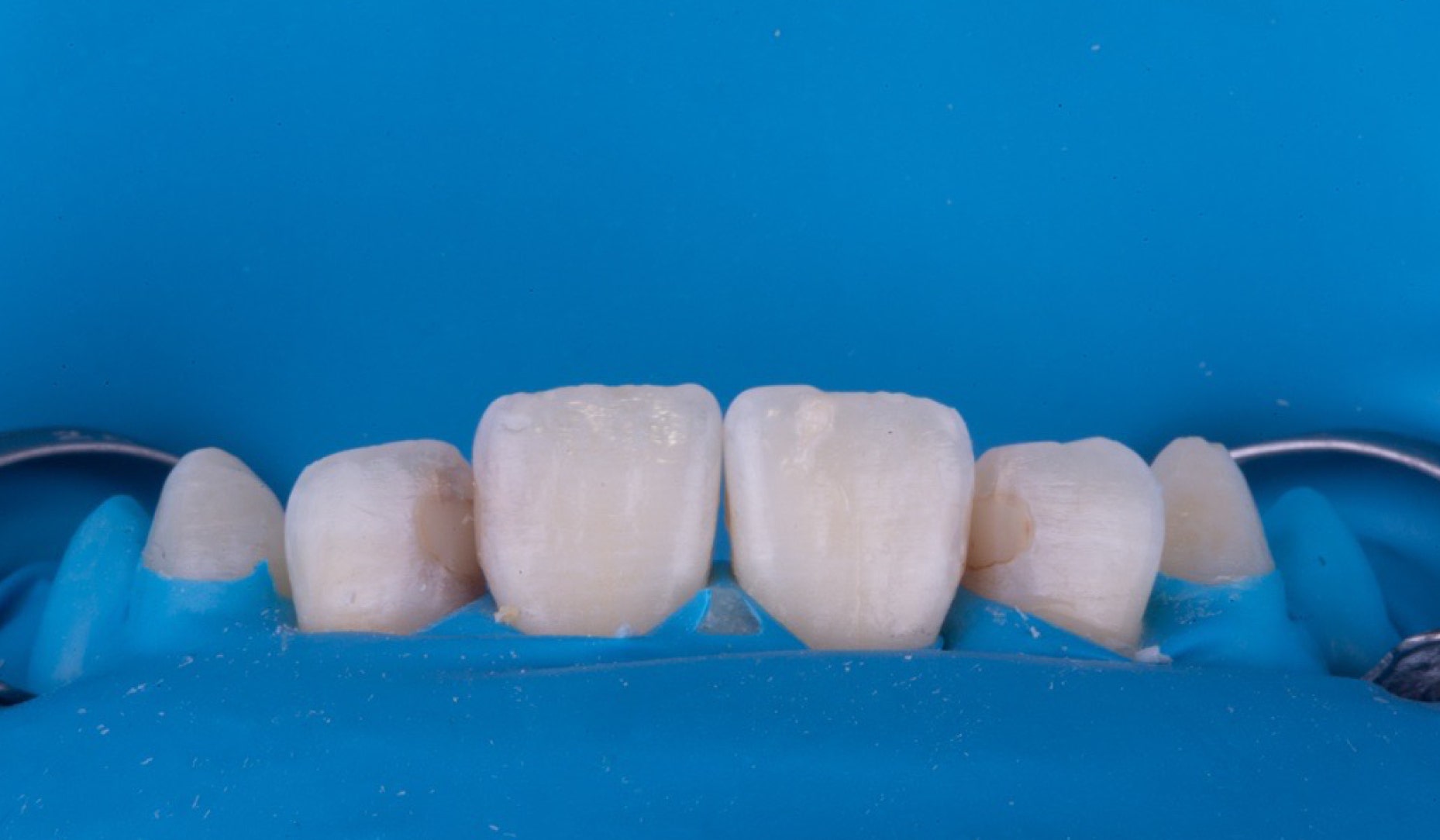 W celu zapewnienia optymalnej kontroli wilgoci i dobrej widoczności pola zabiegowego wykonano izolację przy użyciu koferdamu. Wykonano również zdjęcia dokumentujące stan przedzabiegowy. Ubytki występowały na zębach 22 (mezjalnie), 21 (dystalnie), 11 (dystalnie) i 12 (mezjalnie).