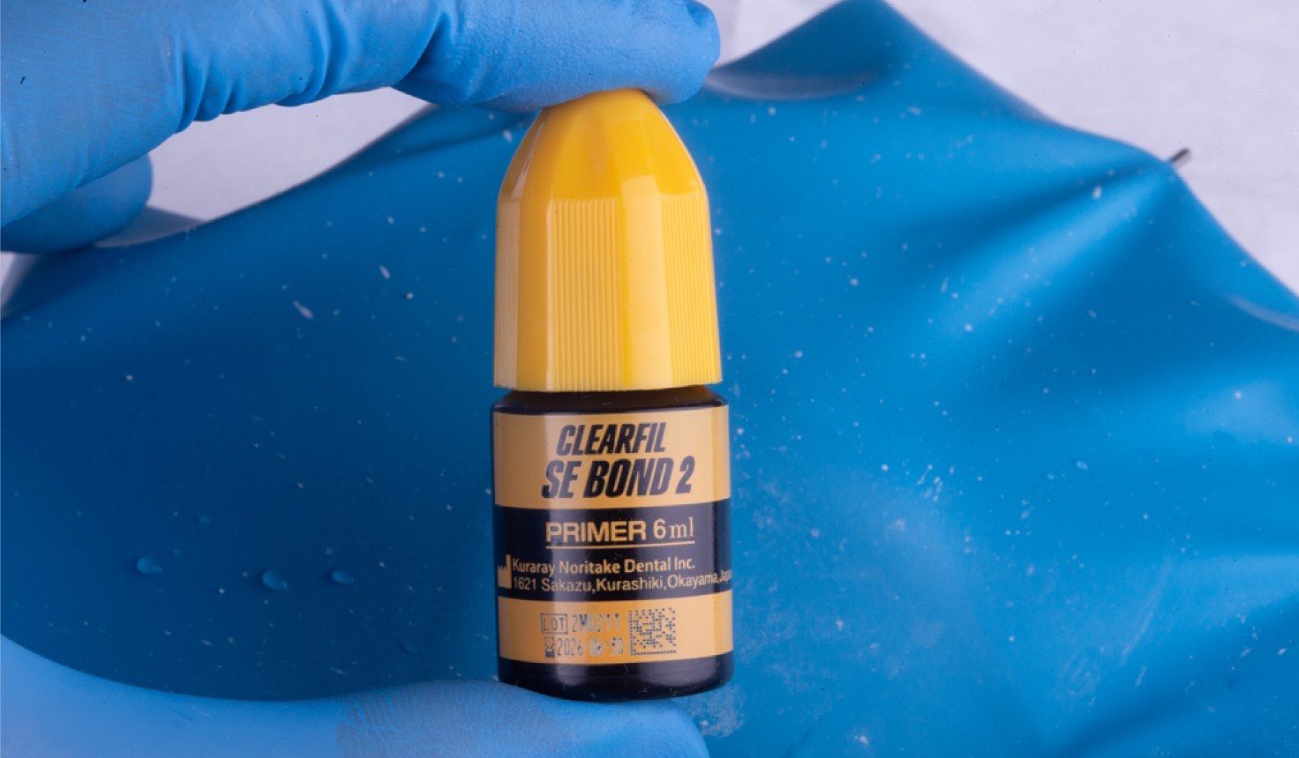Zastosowano dwubuteleczkowy system wiążący CLEARFIL™ SE BOND 2 (Kuraray Noritake Dental Inc.). Zgodnie z protokołem producenta najpierw na wszystkie powierzchnie ubytków nałożono PRIMER, pozostawiono go na 20 sekund, aby umożliwić odpowiednią penetrację tkanek, a następnie delikatnie osuszono powietrzem. Kolejną czynnością było nałożenie BONDu, osuszenie powietrzem i utwardzenie światłem. Ten dwubuteleczkowy, samotrawiący system wiążący szóstej generacji zapewnia niezawodną adhezję nawet w najtrudniejszych warunkach klinicznych oraz długotrwałe i skuteczne wiązanie zarówno ze szkliwem, jak i z zębiną w odbudowach bezpośrednich.