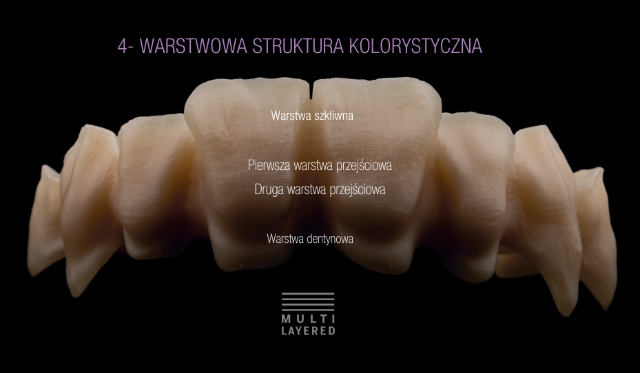 Technologia wielowarstwowych dysków z tlenku cyrkonu umożliwia wykonywanie uzupełnień protetycznych o wyglądzie zbliżonym do naturalnego zęba i przy ograniczonym nakładzie pracy ludkich rąk. Niezależnie od tego, czy użytkownik preferuje pracę z materiałami o stałej wytrzymałości i wybiera je w zależności od wskazań, czy też sięga po uniwersalny dysk: nakład pracy związany z wykończeniem jest znacznie zredukowany dzięki zoptymalizowanej przezierności i naturalnej gradacji kolorów bazowego materiału.