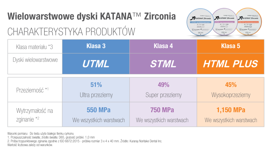 Kiedy firma Kuraray Noritake Dental Inc. zauważyła rosnące zapotrzebowanie na bardziej estetyczne materiały na bazie tlenku cyrkonu i podbudowy o większej przezierności oraz strukturze przypominającej naturalną kolorystykę zęba, postanowiła opracować zupełnie nowy rodzaj tlenku cyrkonu dentystycznego. Firma rozpoczęła tworzenie zaawansowanego procesu produkcji surowców, prasowania i wstępnej synteryzacji we własnym zakresie. Było to podstawą do opracowania pierwszego w branży stomatologicznej wielowarstwowego dysku o płynnej strukturze kolorystycznej i perfekcyjną zgodnością z kolornikiem VITA™. Aby znaleźć najlepsze składniki i procedury wytwarzania, zespół badawczo-rozwojowy eksperymentował z różnymi surowcami, formułami i ziarnistością, opracował sposoby optymalizacji czystości składników oraz skupił się na doskonaleniu jednorodności i gęstości półfabrykatów, a także - oczywiście - integralności różnych warstw. Obecnie dla laboratoriów techniki dentystycznej dostępne są trzy różne produkty oparte na tej oryginalnej technologii wielowarstwowego tlenku cyrkonu: KATANA™ Zirconia UTML, KATANA™ Zirconia STML i KATANA™ Zirconia HTML PLUS. Oferują one różne poziomy przezierności i wytrzymałości na zginanie.