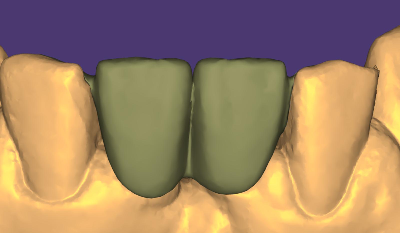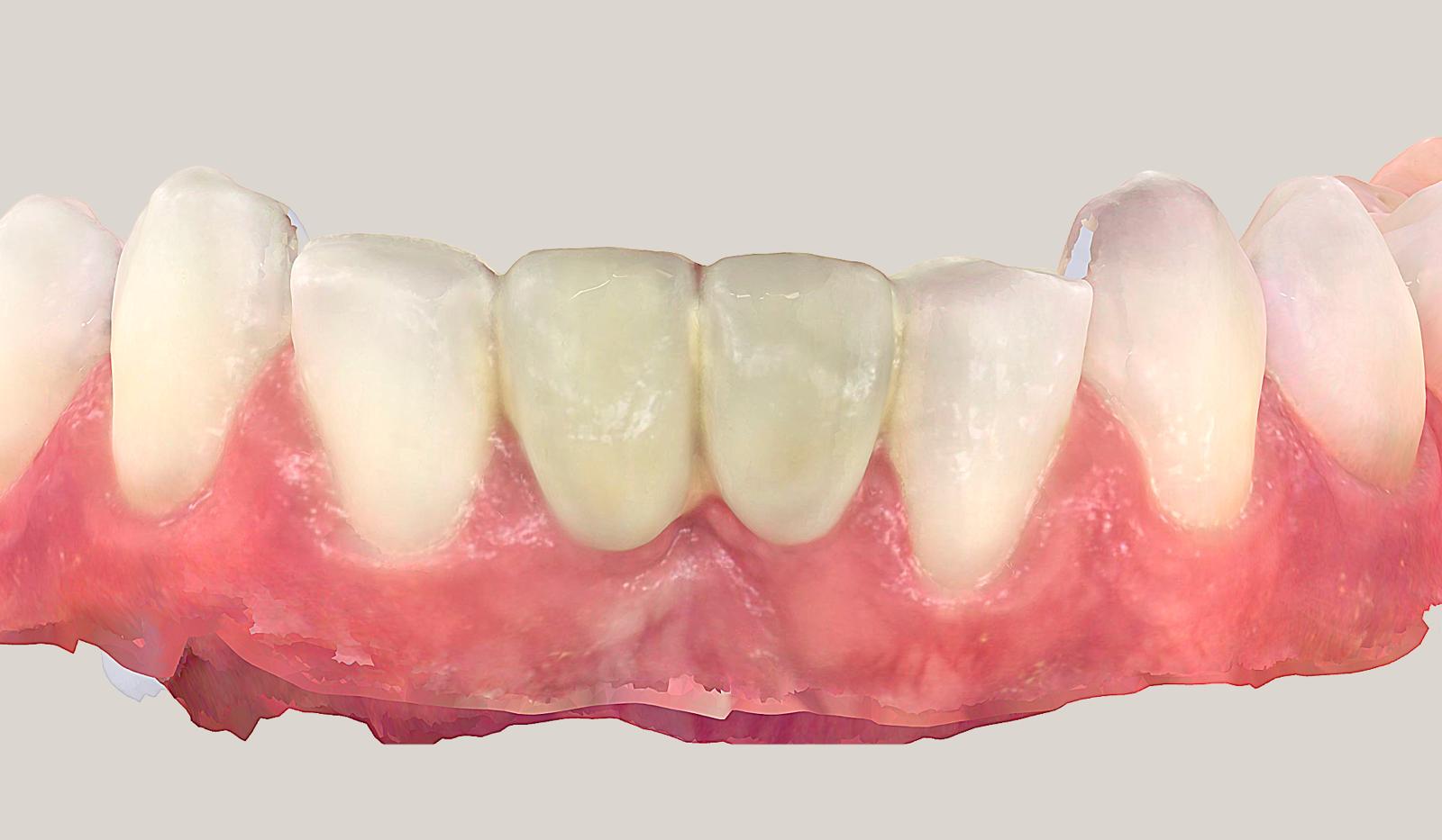 O amprentă a punții a fost luată înainte de îndepărtarea acesteia, utilizând scanerul iTero 5D+ (Align Technology; Figura 2). Aceste scanări pre-tratament, care sunt efectuate aproape sistematic pentru reconstrucțiile noastre protetice, permit laboratorului să capteze volumul protezei existente, să reproducă forma anterioară (dacă este potrivită) și adesea să vizualizeze suprafețele uzate. Acest lucru ajută la minimizarea sau chiar eliminarea necesității adaptărilor ulterioare. Apoi, puntea existentă a fost îndepărtată, iar dinții stâlpi au fost preparați cât mai minim invaziv posibil. Încă o dată, scanerul intraoral a fost utilizat pentru a lua o amprentă a situației (Figura 3)