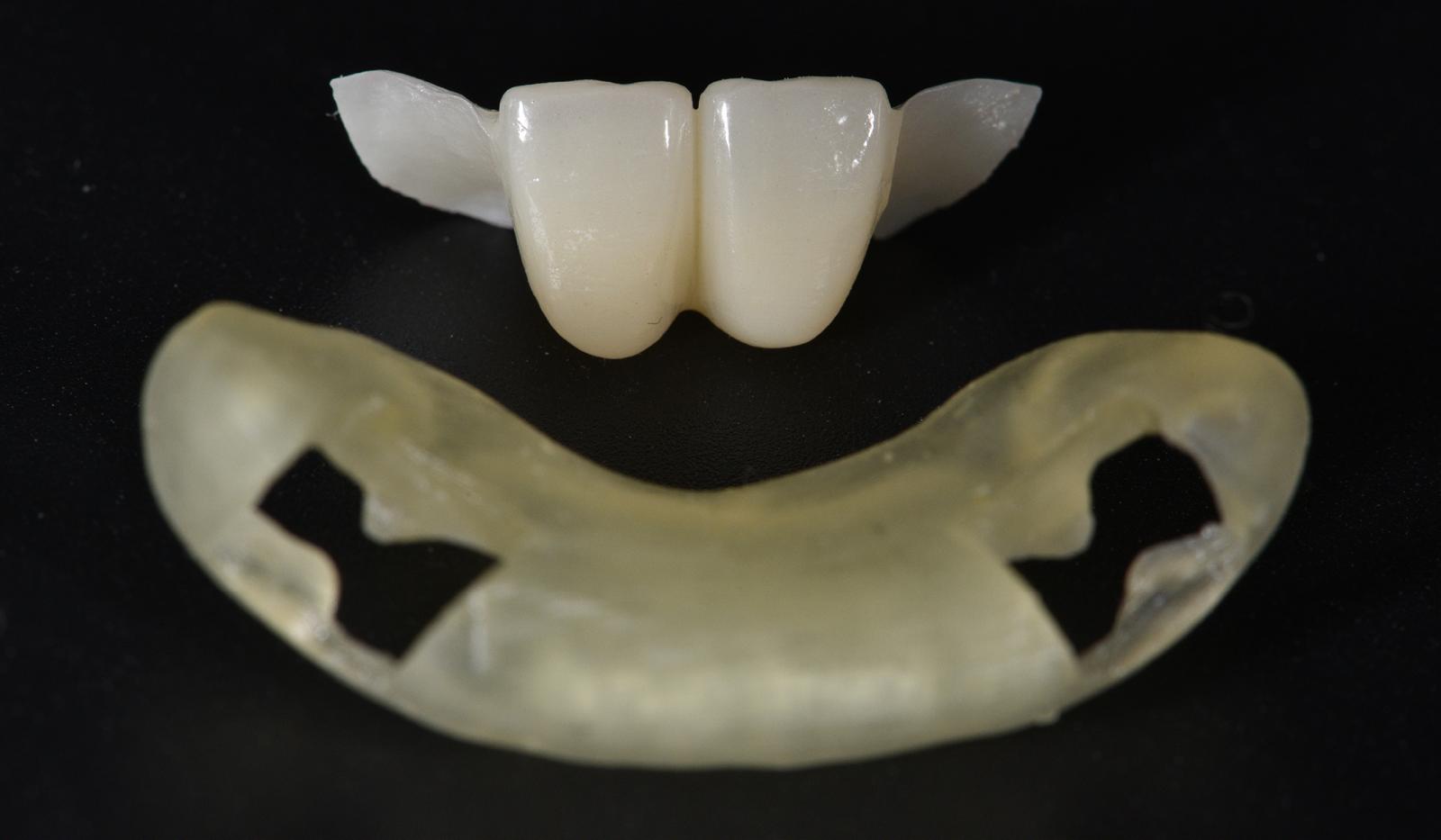 Centrul de producție, DIGISMILE, a primit ulterior fișierele STL ale punții și cheii de poziționare, modelate de tehnicienii dentari pe platforma Design4me, gata pentru frezare și printare. De asemenea, am furnizat laboratorului fotografii intraorale pentru a reproduce textura suprafeței, posibilele personalizări și nuanțe. Laboratorul a efectuat frezarea punții folosind o freză DWX-52D (Roland DG). Lustruirea, finisarea suprafeței și colorarea au fost efectuate folosind freze Komet și ceramică lichidă Miyo (Jensen). Cheia de repoziționare, între timp, a fost printată 3D cu o imprimantă 3D NextDent 5100 (3D Systems) folosind rășină de ghid chirurgical (Figura 8).