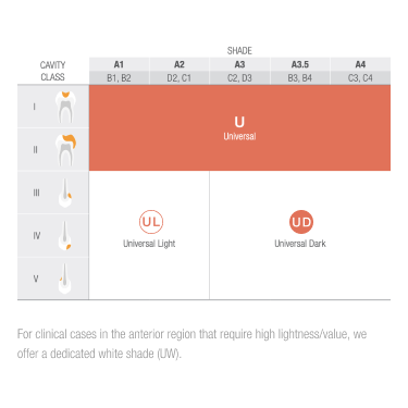 As a reference, use U shade for all posterior cavities, UL for anterior cavities that demand a high value / lightness (A1, A2 ranges) and UD for anterior cavities with lower value / darker appearance (A3, A3.5, A4 ranges). Use UW for the tooth determined as W/XW shade, if the restoration requires an even higher lightness or value. The package includes a chart that can be used as reference.