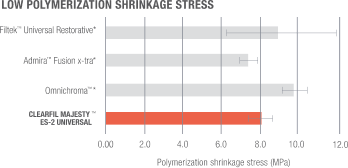 CLEARFIL MAJESTY ES-2 Universal is a simplified system that covers all the shades of the VITA classical A1-D3 shade standard with 3 syringes (an additional Universal White is available for high value restorations). The mechanical properties are identical to those of CLEARFIL MAJESTY ES-2 PREMIUM and CLASSIC.