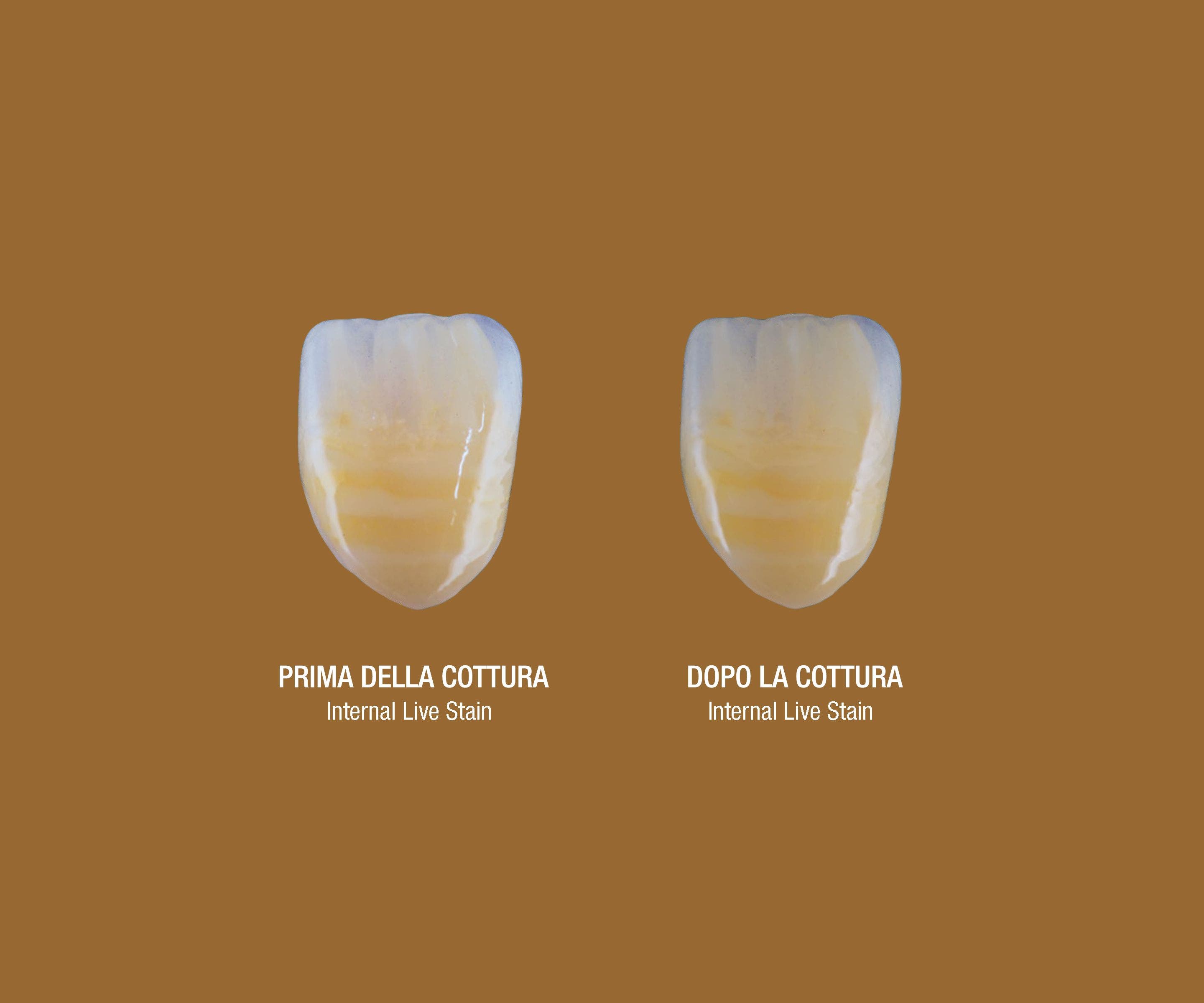 Crea con CZR™ Internal Live Stain effetti interni individuali di sorprendente realismo: l’indice di rifrazione di questi colori, infatti, permette la valutazione del colore finale già prima della cottura in forno.