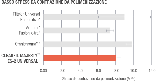CLEARFIL MAJESTY ES-2 Universal (in rosso) mostra un minor livello di usura dello smalto nel dente antagonista in confronto ai materiali della concorrenza testati.