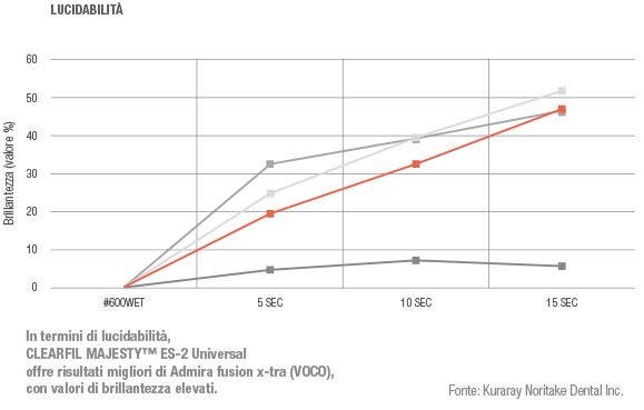 Per un risultato estetico che duri nel tempo, le caratteristiche determinanti sono la lucidabilità del materiale e la durata della brillantezza. Su entrambi i fronti, i risultati ottenuti con CLEARFIL MAJESTY ES-2 Universal superano quelli ottenuti con gli altri prodotti che offrono una scelta del colore semplificata.