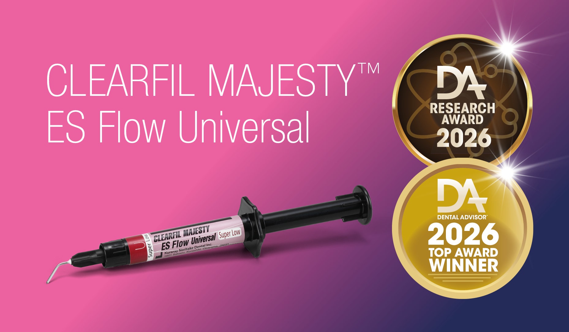 News Feature Which Solutions Truly Deliver in Daily Dental Practice? DENTAL ADVISOR 2026 AWARDS RECOGNISING KURARAY NORITAKE PRODUCTS FOR EXCELLENCE AND RELIABILITY As clinical demands continue to rise and chairside time becomes increasingly precious, dental professionals are nowadays looking for materials and devices that truly deliver in daily practice – while demanding less of themselves. In this context, efficiency, ease of use and long-term performance have become decisive factors in product selection. In a market characterized by frequent product introductions and bold claims, however, identifying the most suitable solutions can be challenging. A useful guide to well-founded decisions: Independent evaluations that combine rigorous laboratory testing with real-practice clinical assessments. One of the most trusted institutions offering this kind of evaluations in the Dental Advisor. Once per year, this respected authority in dental product testing publishes its Top & Preferred Product and Research Awards – highlighting those products that stand out not only for innovation, but for proven, consistent performance. In 2026, several solutions from Kuraray Noritake Dental Inc. were recognized – ranging from a new universal flowable composite to long-established materials that continue to define modern restorative and adhesive dentistry. A PROMISING BLEND OF CHARACTERISTICS: RESEARCH AWARD WINNERS According to Dental Advisor, “Companies that receive Research Awards demonstrate a commitment to advancing dental technology and enhancing patient care.” Product properties are tested in the Dental Advisor Biomaterials Research Center to evaluate the scientific performance and identify those materials with the most promising blend of characteristics. 1. CLEARFIL™ Universal Bond Quick 2 (Research Award and Preferred Product) Launched in 2025, CLEARFIL™ Universal Bond Quick 2 is an enhanced version of the popular multi-mode adhesive CLEARFIL™ Universal Bond Quick. Both stand out due to their minimal application time. Research conducted at the Dental Advisor Biomaterials Research Center demonstrated excellent bond strength to enamel and dentin, even after artificial aging and saliva contamination. The latter indicates a consistent performance even in wet environments like the oral cavity. The in-vitro tests also confirmed a thin film thickness (3-5μm), supporting accurate seating of indirect restorations. 2. CLEARFIL MAJESTY™ ES Flow Universal (Research and Top Product Award) CLEARFIL MAJESTY™ ES Flow Universal is a highly filled flowable composite launched in 2025. It features submicron fillers (78% by weight) and a simplified universal shade system enabled by light diffusion technology. Independent testing in the Biomaterials Research Center of the Dental Advisor confirmed that it delivers some of the highest strength values in its class, along with excellent radiopacity and great shade matching compared with other universal-shade composites. Designed for efficient placement, its syringes and application tips help minimize voids, a benefit confirmed by radiographic analysis of filled syringes and attached tips after dispensing of material. Viscosity testing reveals that the material offers a low-flow, no-slump consistency that allows precise cusp build-up and detailed anatomical sculpting. While the material is available in two flowabilities (Low and Super Low) in Europe, Super Low is the variant offered in the United States and tested in the Dental Advisor Biomaterials Research Center. 3. KATANA™ Cleaner KATANA™ Cleaner became a 2026 Research Award winner without prior clinical evaluation. The universal cleaning agent contains MDP salt, designed to effectively remove contaminants from both restorative materials and tooth structure. Laboratory testing by the Dental Advisor demonstrated that it restores bond strength on saliva-contaminated zirconia and lithium disilicate to optimal levels, with SEM analysis confirming nearly complete surface cleanliness. In its summary of research highlights, the Dental Advisor team stressed that KATANA™ Cleaner is one of the few commercially available cleaners approved for intraoral use. 4. PANAVIA™ Veneer LC (Research Award and Preferred Product) PANAVIA™ Veneer LC is widely recognised for delivering strong, durable bonding and highly aesthetic outcomes in veneer procedures. Laboratory testing revealed that, when used with the US-recommended components – PANAVIA Veneer LC Paste, CLEARFIL™ Universal Bond Quick and CLEARFIL™ Ceramic Primer Plus – the system maintains a high bond strength even after artificial aging. This performance was consistent across multiple substrates, including enamel, dentin, silica-based ceramics (lithium disilicate) and zirconia. Furthermore, the system outperformed two other leading veneer cements in gloss retention and wear resistance. TOP PRODUCT AWARD WINNERS Top Products are “exceptional products [that] have consistently demonstrated their excellence and reliability, earning a lasting place in our publication“. The winners are selected based on laboratory testing and clinical evaluations conducted under real-life conditions: “Our dedicated volunteer evaluators provide unbiased insights from their real-world experiences, ensuring that only the very best receive this prestigious accolade”, as stated on www.dentaladvisor.com. 1. CLEARFIL MAJESTY™ ES Flow A proven favourite, CLEARFIL MAJESTY™ ES Flow earned a Top Award for the 10th time(!), reaffirming its position as a leading product in the direct restoratives category (Composite: Highly Filled Flowable). Recognized for its excellent handling, ease of use, and true-to-life aesthetics, it remains a trusted choice for clinicians seeking versatility and consistently high-quality results. Aesthetic properties were highlighted by one of the evaluators as follows: "The material blended so well with the tooth structure that you had to look h